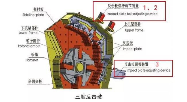 調(diào)整反擊架與轉(zhuǎn)子架之間的間隙可達(dá)到改變物料出料粒度和形狀的目的。、二反擊板通過頂部螺桿調(diào)節(jié)裝置,若存在第三塊反擊板(歐版反擊破),則通過墊片調(diào)節(jié)。