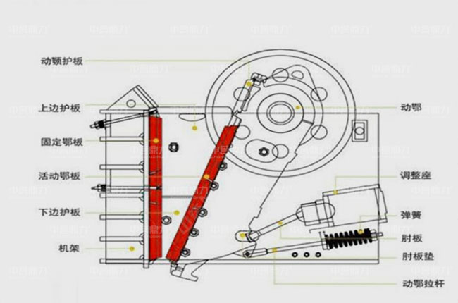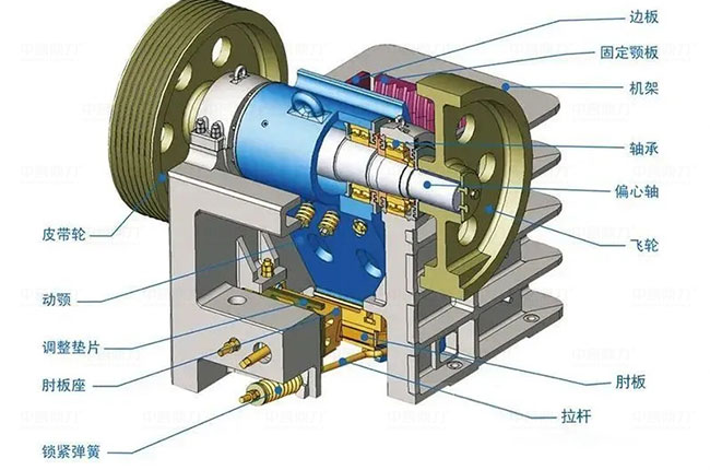 楔塊調節方法:增大出料粒度時,通過轉動螺帽,使楔塊沿著機架的后壁下降,促使前楔塊向后移動,實現推動肘板與動鄂也向后移動,進而擴大開料口,縮小排料口反向操作即可。楔塊調節分機械和液壓兩種方式,液壓方式更省力,無調節,過鐵保護及清腔操作。