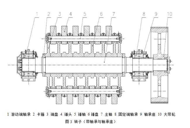 從上面轉子結構示意圖我們看到,2018單段錘式破碎機共有24個錘頭,每排6個,共4排。