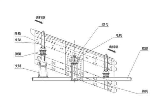 上圖為yah2460型圓振動篩結構圖和工作示意圖,從結構圖可以看到,該設備由箱體、支架、支腿、電機、底座、篩網、支腿等部分組成,篩面安裝傾角建議在20度,傾角過大物料篩分不干凈,傾角過小篩分效率過低,建議在廠家安裝人員指導下合理選擇。篩孔大小也可以根據要處理物料大小進行定制。