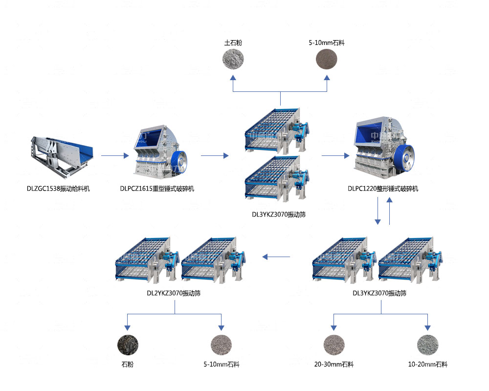利用重錘破一次成型的性能優(yōu)勢(shì),頭破直接出一部分5-10mm成品料,并經(jīng)過頭道篩篩分混料中的土石粉,提高成品料潔凈度,剩余物料經(jīng)過二次破碎后,先后進(jìn)入兩道篩分,分別出20-30mm、10-20mm和5-10mm、石粉等成品料。