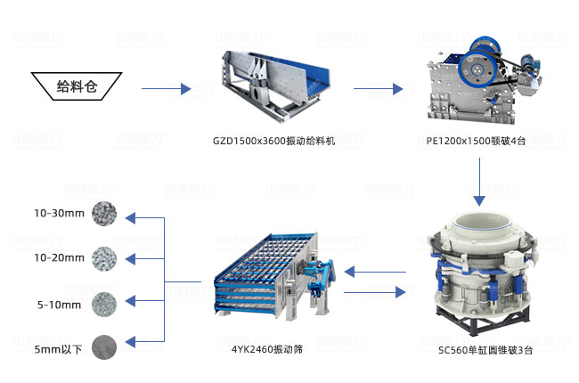 主機設(shè)備包括GZD1500x3600振動給料機、PE1200x1500顎破4臺、SC560單缸圓錐破3臺、4YK2460振動篩。