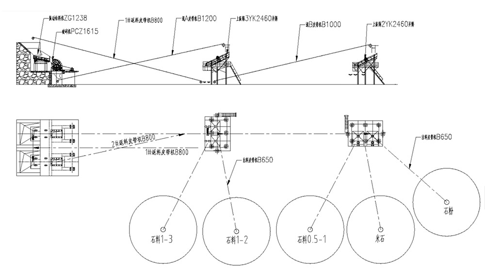 流程描述:大塊石料由DLZG1238振動(dòng)給料機(jī)均勻、連續(xù)的輸送到DLPCZ1615重錘破進(jìn)行粗碎,粗碎后的混合料由1.2米的混料輸送帶送到一臺(tái)3YK2460振動(dòng)篩進(jìn)行篩分,篩分出1-3和1-2兩種成品石子,大于31.5mm的由一條800的返料輸送帶送回到破碎機(jī)再次破碎,小于1-2的石料輸送到二道篩再次篩分,篩分出0.5-1石子、米石和石粉三種成品料。