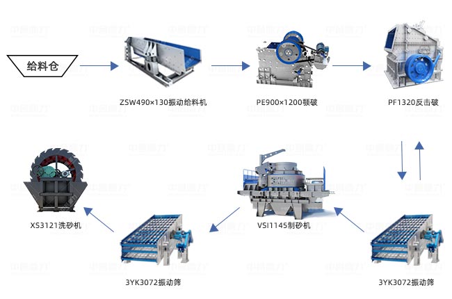 配置設(shè)備:ZSW490×130振動給料機(jī)、PE900×1200顎破、PF1320反擊破、VSI1145制砂機(jī)、3YK3072振動篩*2臺、XS3121洗砂機(jī)。