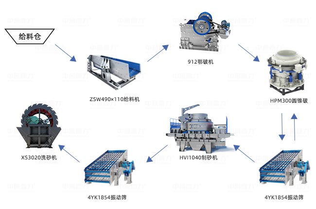 設(shè)備搭配:ZSW-490×110振動給料機(jī)、912鄂破機(jī)、HPM300圓錐破、HVI1040制砂機(jī)、4YK1854振動篩*3臺、3020洗砂機(jī)*3臺