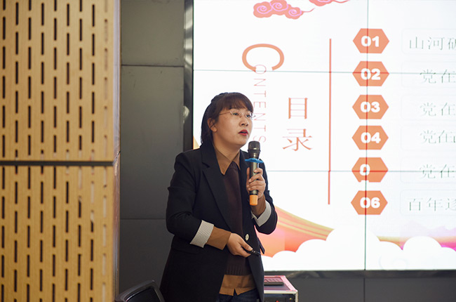 王霞副校長結合當下時政要點和我近現代史實,圍繞“中共百年歷程與經驗啟示”的主題,通過課件、視頻展示,帶大家回顧了中共產黨的成立背景、發展歷程,并講解共產黨百年歷史取得的經驗和啟示。
