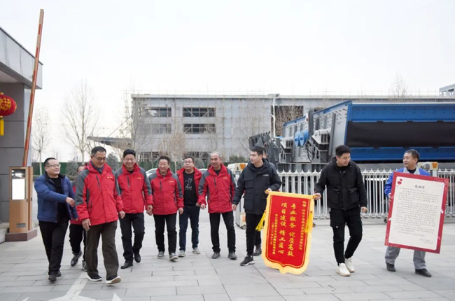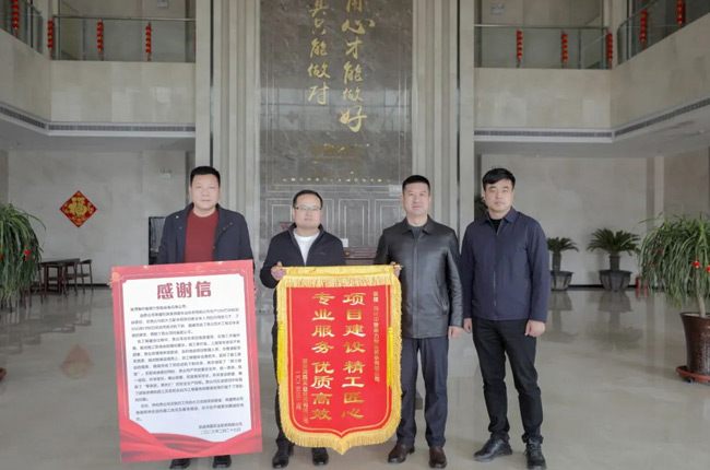1月16日下午,中譽鼎力總經理楊乾、副總經理陳樹凱、銷售經理趙元勝及項目工程師接收天利建材導送來的感謝信和錦旗,并合影留念。