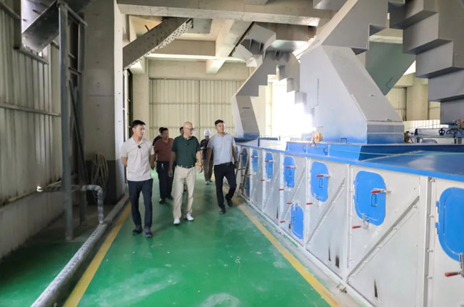 在項目輸送車間,考察團成員著重了解了中譽鼎力創新產品箱式皮帶輸送機及其優勢,點贊該設備環保、省錢省力。