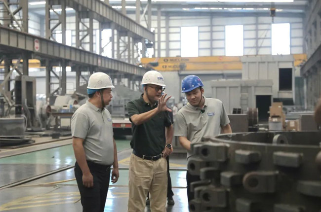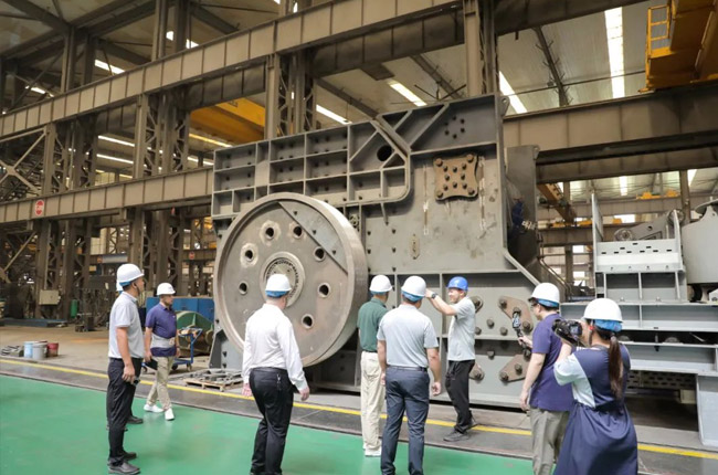 中譽鼎力集團副董事長馬鈺博、技術總監劉海淘在智能化車間為砂石骨料網考察團成員一一介紹了集團主營產品及其制造工藝,并對硬巖設備代表產品臥式旋回破碎機進行了詳細的講解。