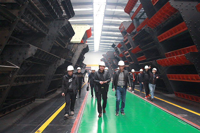 考察團先來到中譽鼎力智能裝備有限公司新廠區,參觀了智能化一體生產車間,對中譽鼎力的設備制造情況進行了了解。