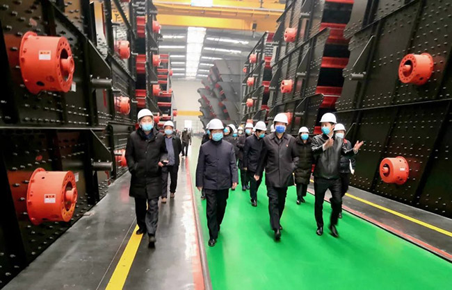 在中譽鼎力智能裝備公司廠區,張治民董事長向各位導詳細匯報公司復工復產情況,并介紹中譽鼎力“五位一體”循環建材產業園及一體化智能生產車間。