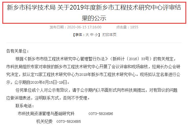 近日,新鄉(xiāng)市科學技術局發(fā)布《關于2019年度新鄉(xiāng)市工程技術研究評審結果的公示》。根據(jù)《新鄉(xiāng)市市級工程技術研究管理暫行辦法》(新科計〔2016〕33號)有關規(guī)定,科學技術局組織開展了“2019年度新鄉(xiāng)市工程技術研究”申報工作。