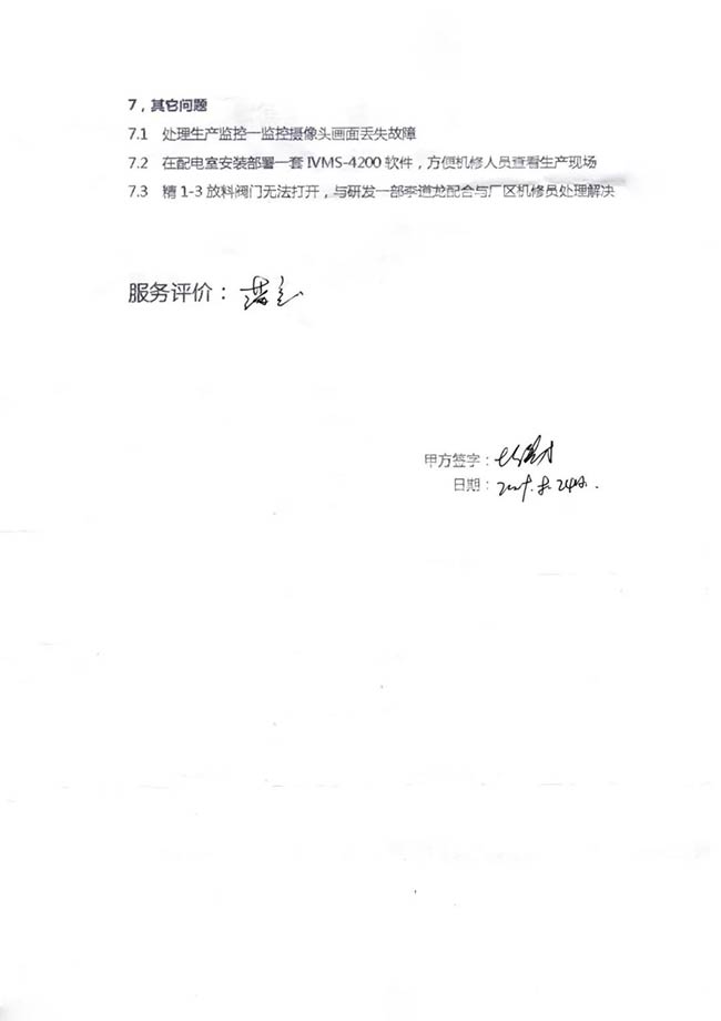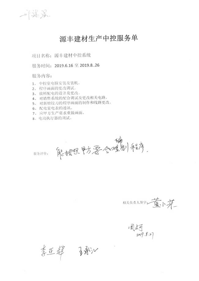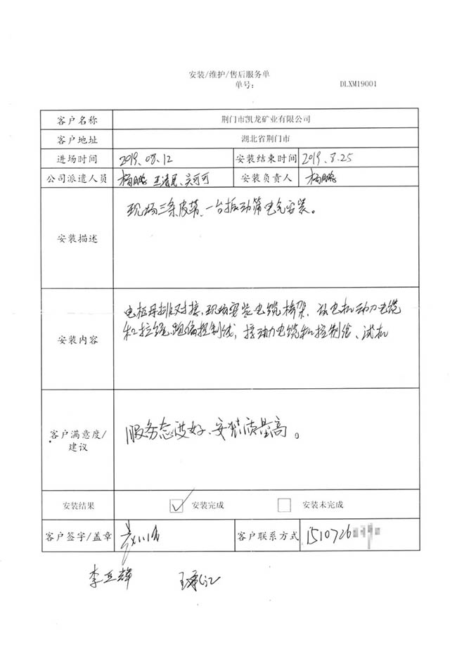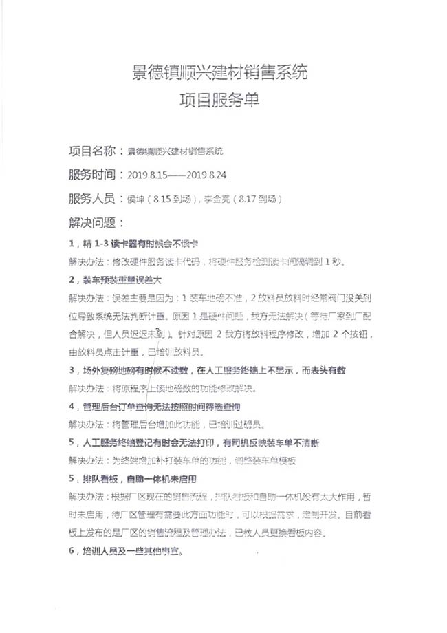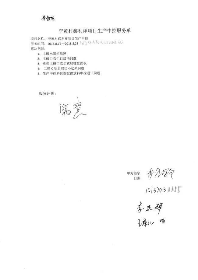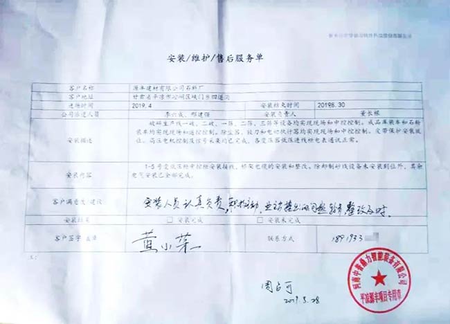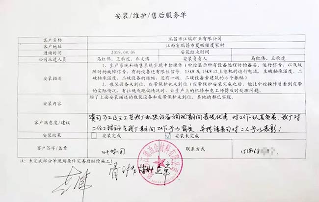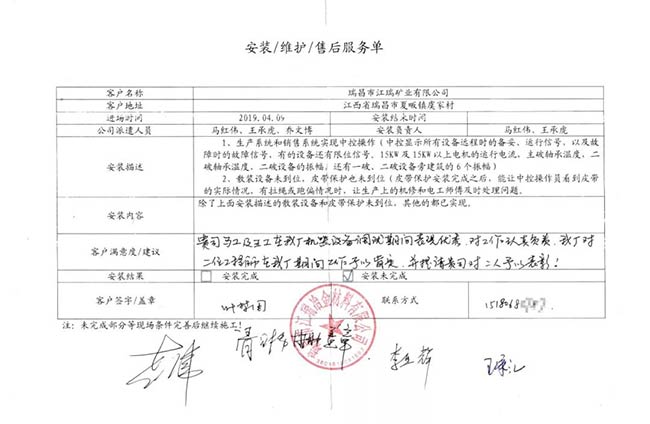 與客戶(hù)打交道的過(guò)程,不僅有電氣成套設(shè)備、低壓配電柜、礦山骨料生產(chǎn)線(xiàn)的管理軟件的安裝調(diào)試,還有監(jiān)控設(shè)備工程、電氣工程的施工等等。咨詢(xún),設(shè)計(jì),施工,調(diào)試,維護(hù),培訓(xùn)……如何做到每一個(gè)環(huán)節(jié)都精益求精,達(dá)到客戶(hù)要求?完善的質(zhì)量管控和服務(wù)體系不可少。而“項(xiàng)目服務(wù)單”就是其中一項(xiàng)重要措施,記載并參與了服務(wù)的過(guò)程。