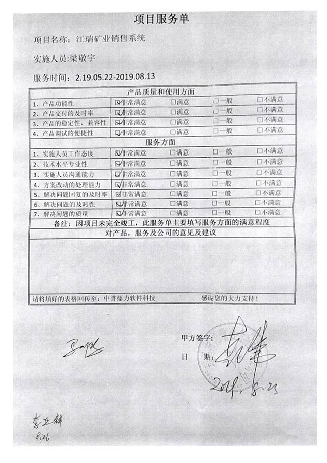 在中譽(yù)鼎力軟件科技股份有限公司,有一張“項(xiàng)目服務(wù)單”。這薄薄的一頁(yè)紙,記載了中譽(yù)鼎力員工去客戶(hù)現(xiàn)場(chǎng)進(jìn)行智能礦山管理系統(tǒng)安裝、維護(hù)、售后、問(wèn)題解決等各項(xiàng)細(xì)節(jié);也是中譽(yù)鼎力員工精細(xì)的施工品質(zhì)、完善規(guī)范的管控機(jī)制,以及追求客戶(hù)滿(mǎn)意的服務(wù)理念的真實(shí)寫(xiě)照。