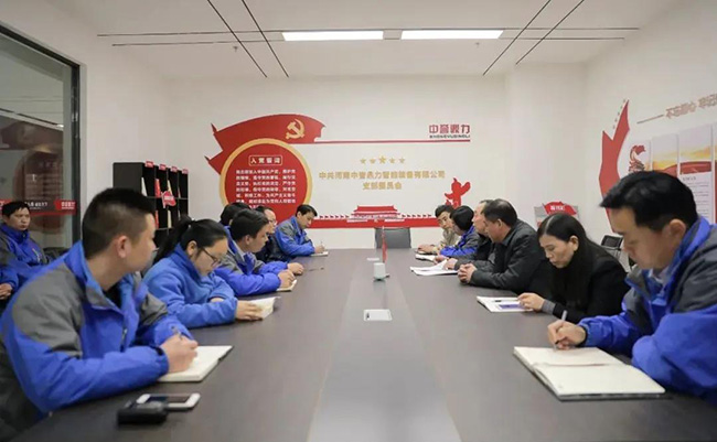 中譽鼎力黨建指導員王士存,新鄉市中譽鼎力軟件科技股份有限公司總經理楊乾,河南中譽鼎力智能裝備有限公司行政副總經理崔玉清、營銷副總經理王春燕、生產副總經理李、黨支部書記、企管部長吳澤朋及各部門20余位黨員代表參加會議。