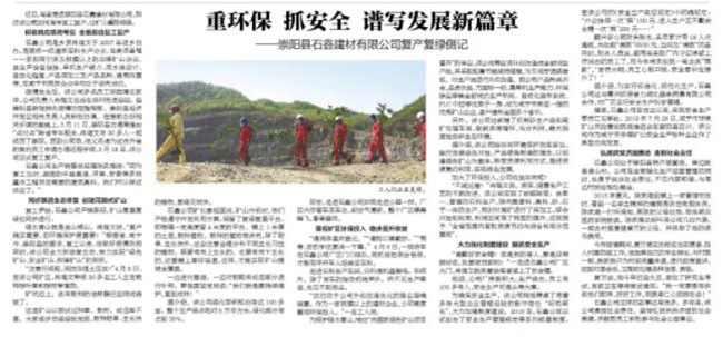 4月底,湖北日報刊文《重環(huán)保 抓安 譜寫發(fā)展新篇章——崇陽縣石鑫建材有限公司復(fù)產(chǎn)復(fù)綠側(cè)記》和湖北電視臺報道《復(fù)工復(fù)產(chǎn)復(fù)綠做表率 崇陽縣石鑫建材再起航》,對中譽(yù)鼎力承建咸陽市石鑫建材環(huán)保智能砂石骨料生產(chǎn)線復(fù)工、復(fù)產(chǎn)、復(fù)綠情況進(jìn)行了方位宣傳。