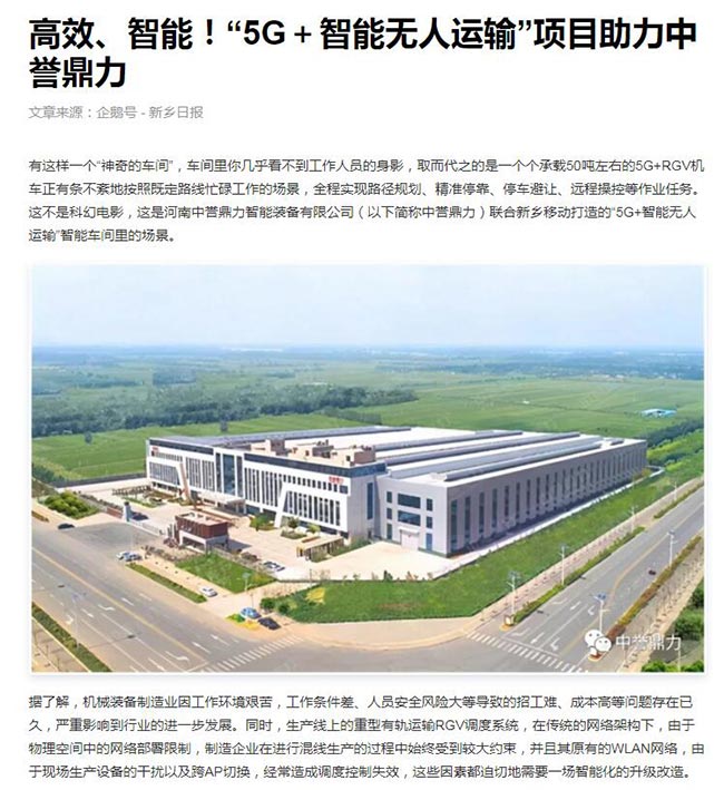 《、智能!“5G+智能無人運(yùn)輸”項(xiàng)目助力中譽(yù)鼎力!》,12月15 日,《新鄉(xiāng)日報》報道公司積打造智能化車間,利用智能管理調(diào)度系統(tǒng)實(shí)現(xiàn)遠(yuǎn)程實(shí)時控制,為中譽(yù)鼎力將5G”從理論到應(yīng)用”做出良好的行為點(diǎn)贊。