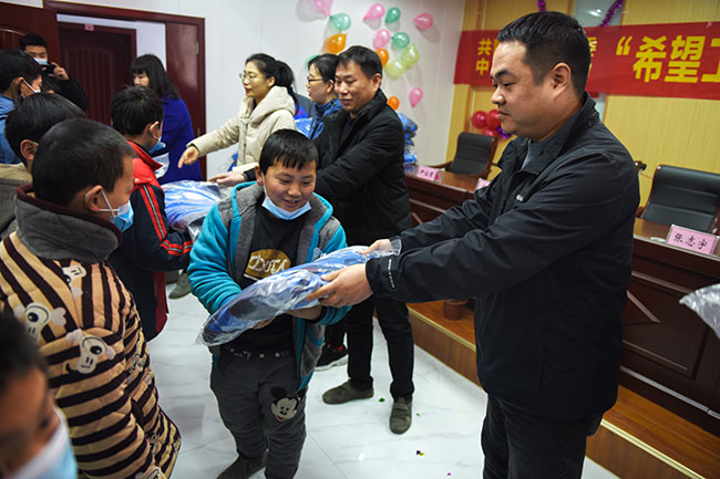 河南中譽鼎力智能裝備有限公司常務(wù)副總張志宇為學(xué)生分發(fā)棉衣
