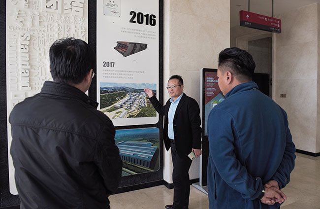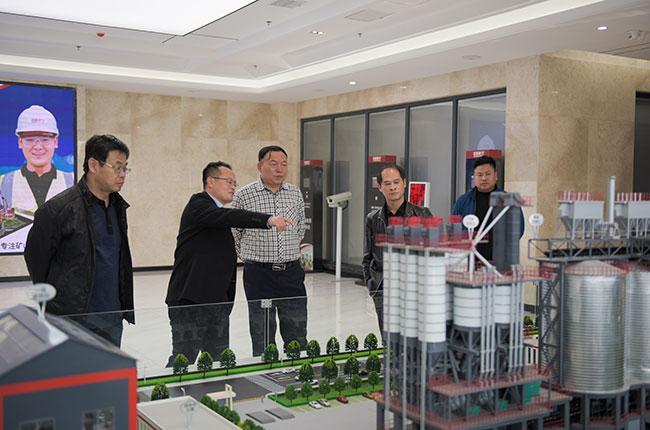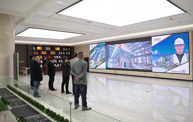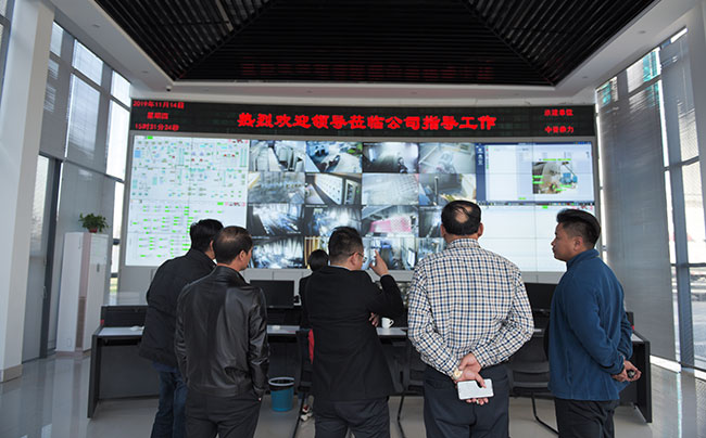 考察團先來到中譽鼎力智能裝備有限公司新廠區,先后了解了中譽鼎力企業發展歷程、五位一體循環建材產業園項目、智能化一體生產車間和智能礦山管理系統。