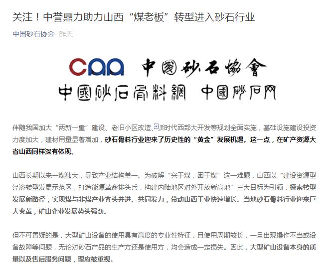 中砂石協會發表關于"中譽鼎力助力山西‘煤老板’轉型進入砂石行業"的報道