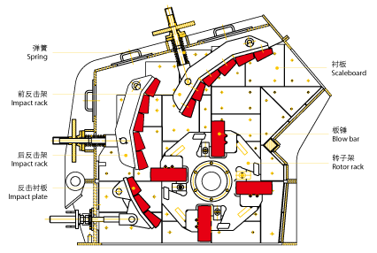 錘破:經給料機進入破碎機進料口的礦料,在高速旋轉的錘頭的作用下被次破碎,之后反彈,又以高速撞擊在反擊板上進一步被破碎,在整個過程中,礦石受到多次破碎,破碎合格的礦料經過篩條裝置排出,不合格的礦料繼續留在破碎腔破碎,大塊石料在破碎腔內受到多次破碎,合格的礦料被及時排出,不會出現過粉碎現象。