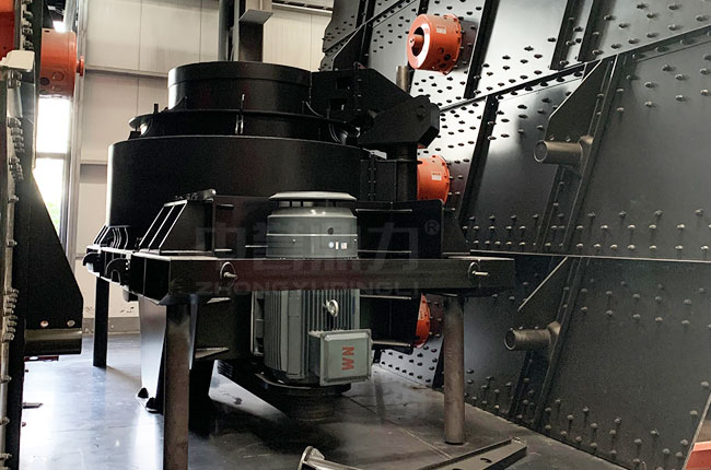 石料由機器上部直接落入高速旋轉的轉盤,在高速離心力的作用下,與另一部分以傘型方式分流在轉盤四周的靶石產生高速度的撞擊與高密度的粉碎,石料在互相打擊后,又會在轉盤和機殼之間形成渦流運動而造成多次的互相打擊、磨擦、粉碎,從下部直通排出。形成閉路多次特環,由篩分設備控制達到所要求的粒度。