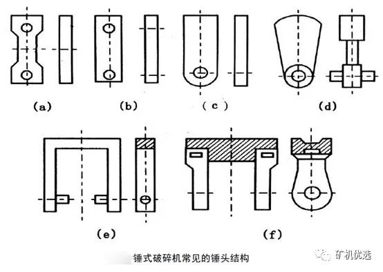 上圖中(a)、(b)、(c)是輕型錘頭,質(zhì)量通常為3.5~15.0kg,多用于破碎塊度為100~200mm的軟質(zhì)和中硬物料。其中(a)、(b)兩種是兩端帶孔的,磨損后可以調(diào)換4次;而(c)種錘頭只能換2次。(d)為中型錘頭,質(zhì)量為30~60kg,且距懸掛較遠(yuǎn),多用于破碎800~1000mm的中硬物料;而(e)、(f)是重型錘頭,其質(zhì)量為50~120kg,主要用來破碎大塊且堅(jiān)硬的物料。