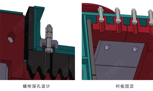 該系列機型采用六角頭高強螺栓固定主襯板、側襯板,螺栓頭部沉孔為深孔型設計,防止由于破碎原材料小而磨損螺栓頭部