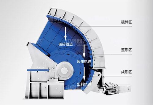 在第三反擊區(qū)的可調(diào)節(jié)反擊板上留出空隙,讓直徑小于空隙的物料直接自然流出,避免再次破碎,提升產(chǎn)能的同時(shí),大大減少產(chǎn)粉率,是在物料合適的情況下是替代傳統(tǒng)反擊式破碎機(jī)的可選產(chǎn)品。