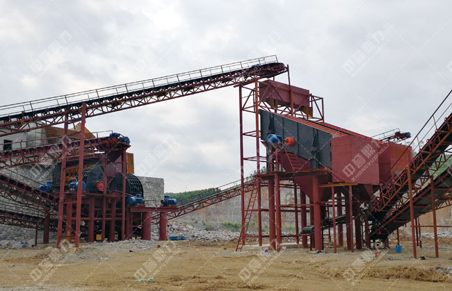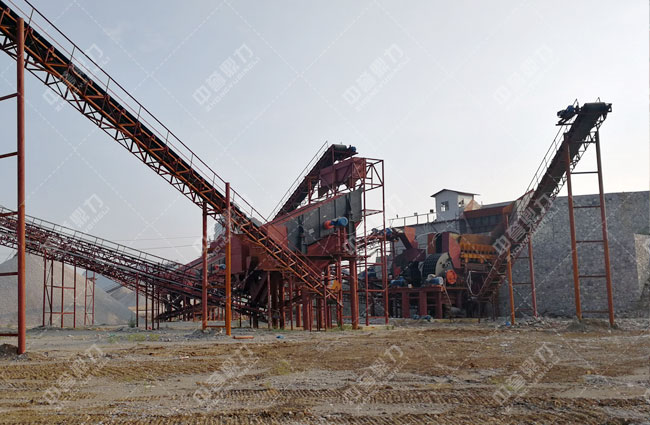 石料由ZGC2038振動(dòng)給料機(jī)均勻地送到頭破(PCZ1815重型錘式反擊破碎機(jī))進(jìn)行粗破,粗破后的物料由膠帶輸送機(jī)送入到二破(XPC1216錘式破碎機(jī))進(jìn)行細(xì)碎,細(xì)碎后的物料被輸送到兩道并篩中進(jìn)行篩分,篩分出五種不同規(guī)格的成品料,由輸送帶送到成品料堆。成品粒度可按用戶的需求進(jìn)行組合和分級(jí)。