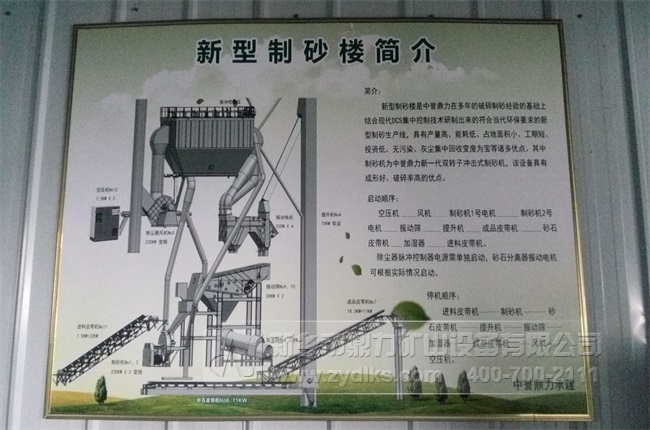 在時產300噸塔樓制砂生產線現場我們看到,中譽鼎力制砂樓建設采取集中建設的方式,在項目指示牌上可以一目了然的了解成套設備組成和生產過程,生產過程方便快捷,所有生產過程均在制砂樓上完成,成品砂可以直接用于銷售。