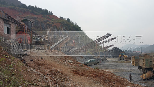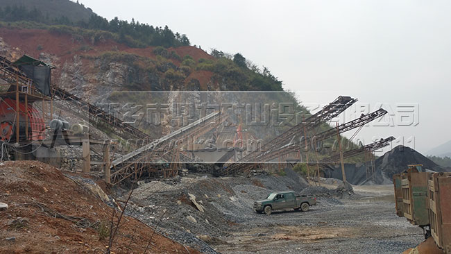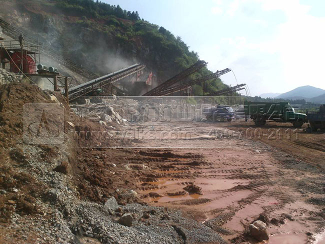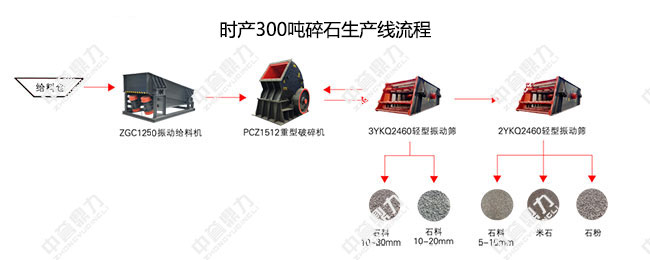 時產300噸碎石生產線設備配置:PCZ1512重型錘式破碎機、ZGC1250振動給料機、YK1860振動篩*2臺等