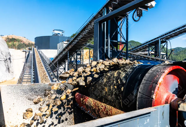 · 原礦初破:自卸車運至堆場→DLPCZ1820錘破粗碎→封閉廊道(400m)輸送至加工區中轉倉