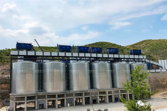 鋼板儲料罐進行物料存儲,配備自助裝車系統,司機刷卡按需裝車,環保、;