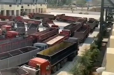 砂石生產線中排隊等待拉料的貨車現場視頻